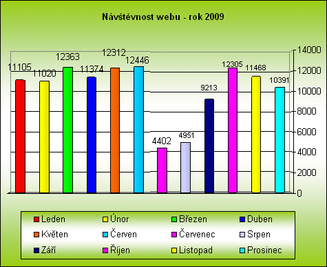 A vezmeme to pěkně popořádku. Rok 2009 začal lednem, samozřejmě jako vždy. Hned 1. ledna 2009 přišlo na tento web přesně 275 lidí (malá zajímavost, už teď je jasné, že 1.1. 2010 je v návštěvnosti lepší než 1.1. 2009). Za celý měsíc k nám nakouklo celkem 11 105 lidí. Leden 2009 skončil v žebříčku měsíční návštěvnosti na sedmém místě. Průměrně k nám na web každý den přišlo 358,22 návštěvníků. Rekordní denní návštěvnost v lednu 2009 byla 12.1. a tehdy přišlo 707 lidí. Naopak nejméně lidí přišlo v neděli 4.1. - 170 lidí.